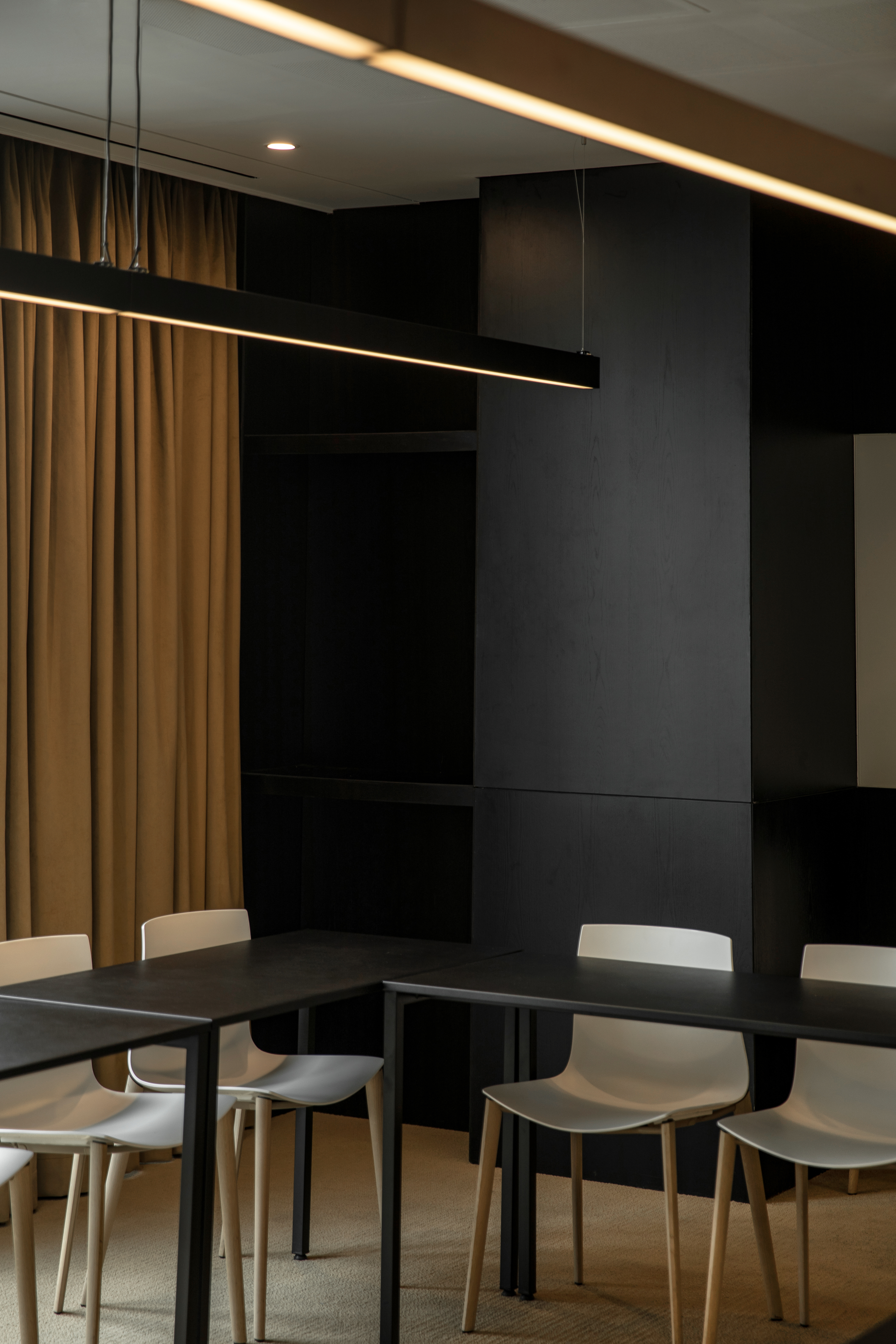 Private and shared spaces are connected by geometric shapes and curves in this co-working office project in Euljiro, Seoul. Textured glass partitions and curtains create multifunctional and adaptive spaces for workers. Completed in collaboration with Fastfive.